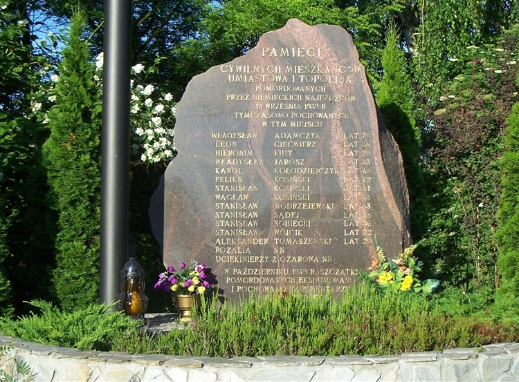 13 wrzesnia 1939 r. w Umiastowie i Topolinie hitlerowcy zamordowali ok. 20 mieszkańców tych wsi i pobliskiego Ożarowa. Dogasała właśnie bitwa ołtarzewska, w której żołnierze armii ,,Łódż,, i ,,Poznań,, próbowali się przebić do okrążonej przez wojska niemieckie Warszawy. Od płn-wsch. z kierunku Kręczek nadjechali do Umiastowa i Topolina Niemcy. Wypędzali ludzi z domów na środek drogi. Pojawił się oficer na koniu, cos krzyczał - żołnierze oddzielili kobiety i dzieci, a mężczyzn rozstrzelali. Wsie podpalono. Uciekinierzy z Ożarowa schronili się w piwnicy domu p. Gołębiewskich w Umiastowie. Niemcy kazali im wyjść, rozpędzili po polu i zaczęli strzelać. Zginęło co najmniej pięć osób. Władysław Adamczyk zginął w płomieniach swojego domu. Nieznana z nazwiska Rozalia schroniła się w ziemiance, Niemcy wrzucili tam granaty. W nocy ciala zamordowanych pochowano przy drodze między Topolinem i Umiastowem.