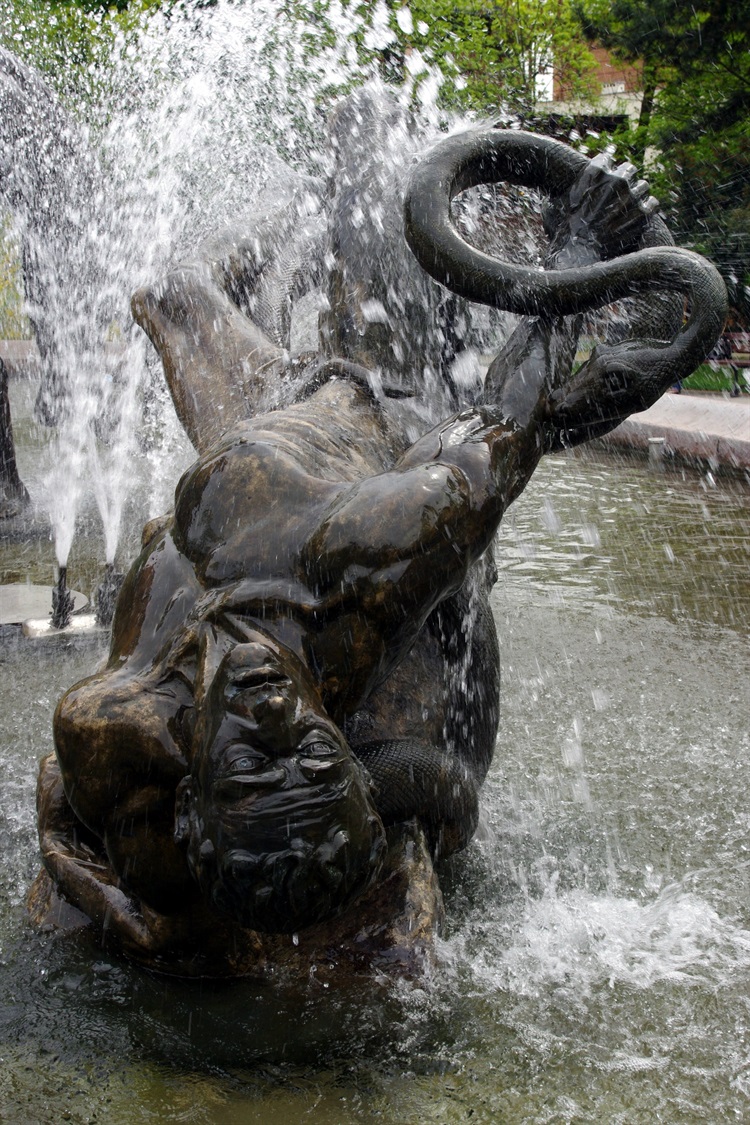 Kiedy w roku 1897 Krajowa Komisja Sztuki Królestwa Prus ogłosiła konkurs na projekt fontanny w Bydgoszczy zapewne nikt nie przypuszczał, że stanie się ona symbolem miasta i jedną z największych atrakcji Bydgoszczy. Komisja za najlepszy projekt uznała pracę berlińskiego rzeźbiarza Ferdinanda Lepcke przedstawiającą sceny z biblijnego potopu. Budowa fontanny trwała 6 lat, a jej uroczyste odsłonięcie miało miejsce 23 lipca 1904 r. Rzeźba odlana była z brązu i liczyła 6 metrów wysokości. Oglądając dziś archiwalne zdjęcia tej fontanny mogę śmiało stwierdzić, że była ona w stanie zachwycić wszystkich, którzy ją widzieli. Na samym środku na szczycie skały stał mężczyzna, który jedną ręką trzymał bezwładną kobietę, a drugą pomagał innemu mężczyźnie wejść na skałę. Nieco niżej leżała nieprzytomna kobieta, a obok niej malutkie dziecko. Były też rzeźby przedstawiające zwierzęta: lwa i niedźwiedzie oraz węża, który oplatał tonącego człowieka.