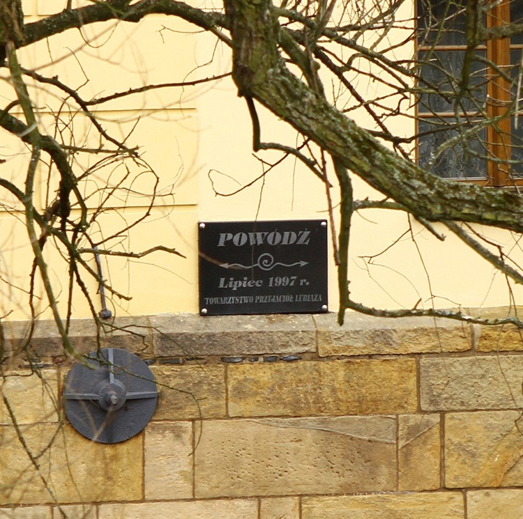 Na budynku bramnym prowadzącym na teren klasztoru wisi tablica upamiętniająca powódź w 1997 roku. Płytę zawieszono przy fosie w pobliżu zabytkowego mostu zbudowanego w XVI wieku. Pamiątkową tablicę odsłonięto z z inicjatywy Towarzystwa Przyjaciół Lubiąża. Na tablicy widnieje poziom wielkiej wody oraz data: Lipiec 1997 r.