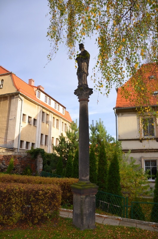 Przy kościele św. Jerzego na wysokiej kolumnie zwieńczonej motywami roślinnymi i główkami aniołków umieszczona została figura św. Jana Nepomucena. Kamienna, barokowa postać przedstawia św. Jana w szatach kapłańskich z krzyżem trzymanym w obu rękach, opartym na prawym ramieniu.