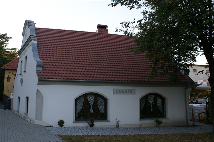 Zabytkowy budynek usytuowany na zewnątrz murów obronnych przy drodze prowadzącej do zamkowego parku. Niedawno przeszedł gruntowną renowację. Niestety nie znamy dokładnej daty jego wzniesienia. W dokumentach z 1571 r. widnieje zapis, że na przedmieściu, nieopodal zamku był dom zamieszkały przez winiarza. Może chodzi tu o budynek oberży. Natomiast dokument z 1775 r. opisuje skutki pożaru, jaki wybuchł w mieście. W czasie tej pożogi uległ spaleniu dom nazywany Kretscham (oberża). Być może jest to informacja o gospodzie mieszczącej się tutaj w XVIII i XIX w.