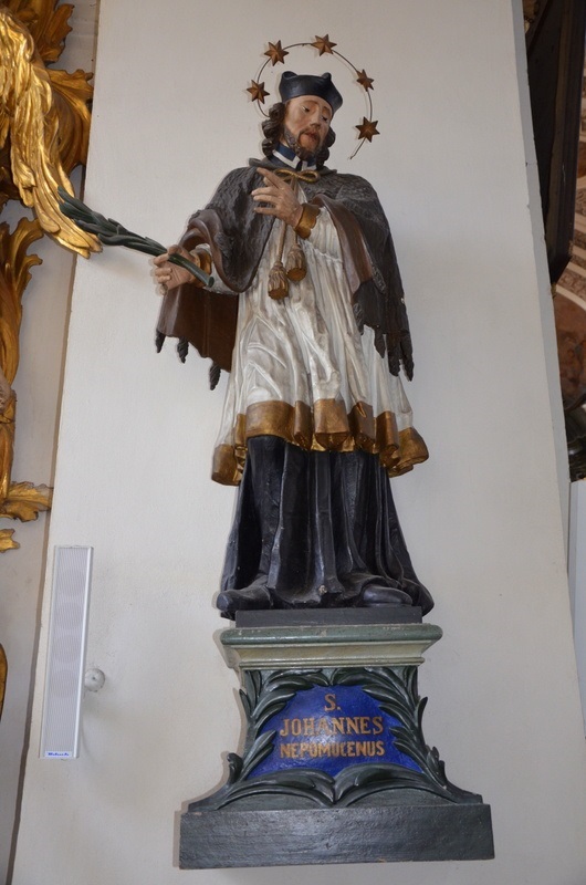 W tym niewielkim uroczym zabytkowym miasteczku wzmiankowanym już w 1155 r. możemy zobaczyć 5 barokowych figur Jana Nepomucena oraz obraz z wizerunkiem świętego. Pierwsza figura znajduje się na niewielkim placu na zewnątrz muru kościoła św. Mikołaja i Franciszka Ksawerego. Na niewielkim prostym cokole stoi kamienna figura świętego Jana Nepomucena z połowy XVIII wieku z pięciogwiezdną aureolą oraz złotą gałązką palmy. Nieopodal na tym samym placu stoi jeszcze jedna kamienna, figura świętego. Barokowy Jan przedstawiony jest z odkrytą głową, nad którą widniała aureola. Niestety aureola pozostała w stanie szczątkowy. Na postumencie wyryty został rok 1747 rok, w którym zapewnie został wykonany.