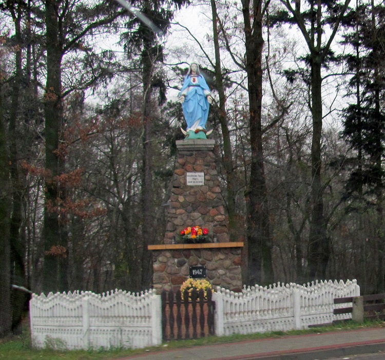 Maryja w niebieskiej szacie, przystrojona kwiatami, otoczona niskim, białym, betonowym płotem. Stoi na wysokim, kamiennym postumencie, na którym widnieje napis: "Niepokalane Serce Maryi módl się za nami, 1947". W 2005 roku została odnowiona. Figura stała się najważniejszym miejscem kultu mieszkańców. W maju odbywają się tu nabożeństwa majowe.