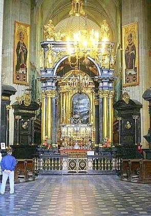 Ponad arkadami na belkowaniu umieszczona została drewniana , złocona kopuła z latarnią. Przy kopule ustawione zostały figury czterech ewangelistów. Czasza kopuły polichromowana od wewnątrz z alegoriami czterech cnót. Pod tym olbrzymim baldachimem na ołtarzu z różowego marmuru czterej klęczący aniołowie unoszą srebrną trumnę (200 kg) zawierającą relikwie świętego. Trumnę zdobią medaliony przedstawiające sceny z życia i dokonanych cudów. Na wieku trumny kartusz herbowy, nad którym skrzyżowane są miecz z pastorałem oraz mitra biskupia unoszona przez anioły.