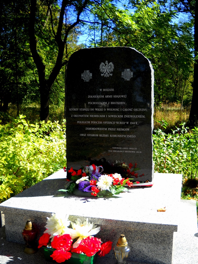 Podrzeszowska wieś Bratkowice leży na skraju wielkiego kompleksu leśnego. W czasie okupacji lasy te dawały schronienie licznym zgrupowaniom partyzanckim. O tym okresie przypomina pomnik znajdujący się w parku podworskim. Wzniesiony został w roku 2011 staraniem Samorządu Gminy Świlcza oraz mieszkańców Bratkowic w 69 rocznicę Akcji "Burza". To właśnie w bratkowickim parku 26 lipca 1944 roku miała miejsce koncentracja bojowników podziemia przed tą operacją. W jej wyniku zginęło lub zostało zamordowanych przez hitlerowców kilkunastu miejscowych żołnierzy Armii Krajowej.