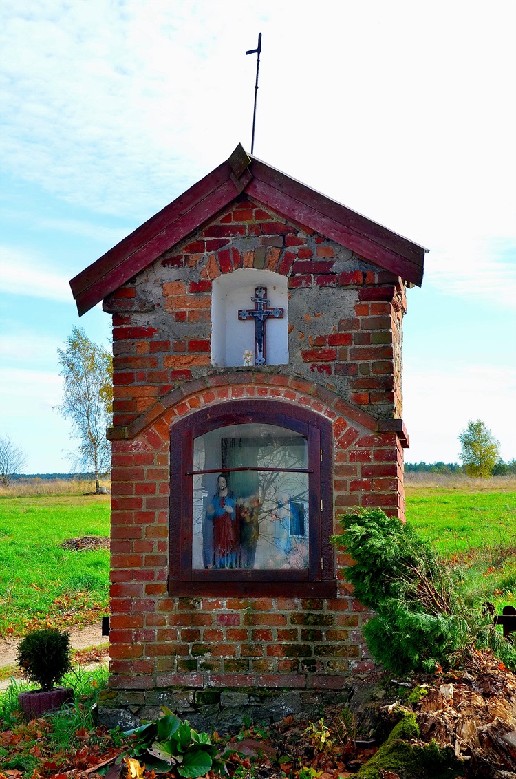 Na drugą kapliczkę natkniemy się przy piaszczystej drodze prowadzącej do pobliskiej Kalwarii w Głotowie. Kapliczka ta to prawdziwa perełka utrzymana w stylu barokowym, dwuniszowa i otynkowana na biało. Została wybudowana w roku 1742. W 2004 r. przeprowadzono jej gruntowny remont, niestety po konserwacji nie powróciła na miejsce oryginalna barokowa rzeźba. Obecnie w otwartej dużej niszy znajduje się współczesny krucyfiks. Mimo że kapliczka ta znajduje się na uboczu i usytuowana na polu, jest bardzo zadbana a otaczający ją drewniany płot i jej biel bardzo harmonizują z otoczeniem.