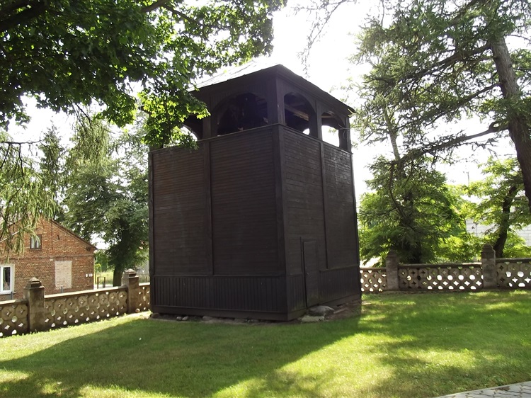 Dzwonnica drewniana w Dąbrowie usytuowana jest kilkanaście metrów od świątyni parafialnej. Wystawiono ją w tym samym czasie co kamienną podmurówkę pod przeniesiony z Ostrowi Mazowieckiej kościół drewniany. Budowla konstrukcji słupowej, wzmocnionej ryglami i zastrzałami. W 3/4 wysokości oszalowana poziomo, w partii dolnej - pionowo. Zbudowana na rzucie kwadratu o boku 5 m 60 cm. Jednokondygnacyjna z otworem wejściowym od północy. Górna część ażurowa z wyciętymi z każdej strony dwoma otworami dzwonowymi o kształcie leżącego prostokąta zakończonego łukiem odcinkowym. Dach namiotowy kryty blachą, zwieńczony sterczyną z krzyżem.