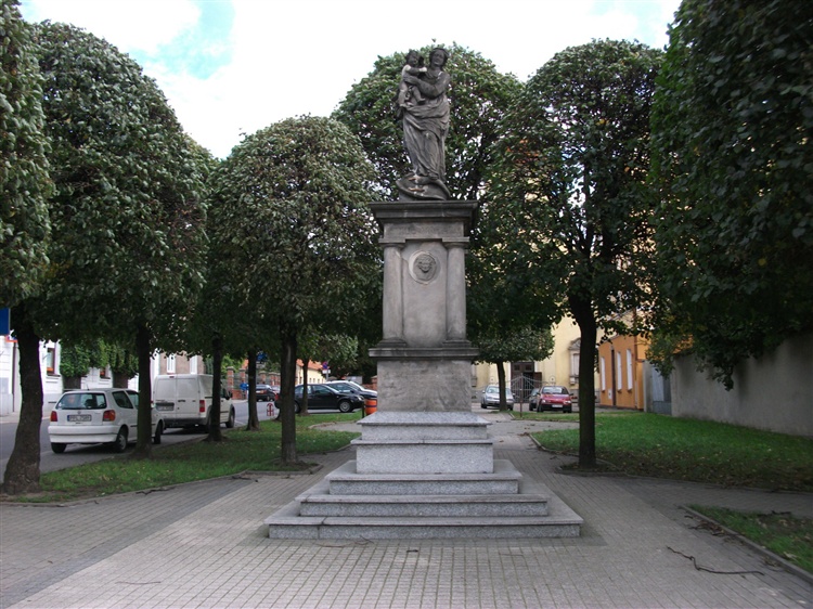 Przed II wojną światową, na pleszewskim Rynku w każdym narożniku stała figura. Dziś pozostała tylko barokowa figura Matki Boskiej z Dzieciątkiem. Obecnie stoi ona przy wyjściu z Rynku na Plac Kościelny. Cokół postumentu ozdobiony jest madalionami z wizerunkami św. św. Barbary, Jana Chrzciciela oraz Floriana.