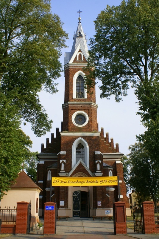 Zbudowany został z czerwonej cegły, jednonawowy z wieżą zwieńczoną złotą kulą z krzyżem. Dwa lata później 28.04.1913 konsekrowany przez biskupa Stanisława Zdzitowieckiego. Po wybuchu II wojny światowej hitlerowcy urządzili w nim areszt, a w latach 1941-45 magazynowano w nim zboże. Po zakończeniu wojny świątynia ponownie pełni funkcje sakralne. Przed kościołem kamień narzutowy z tablicą pamiątkową poświęconą papieżowi Janowi Pawłowi II.