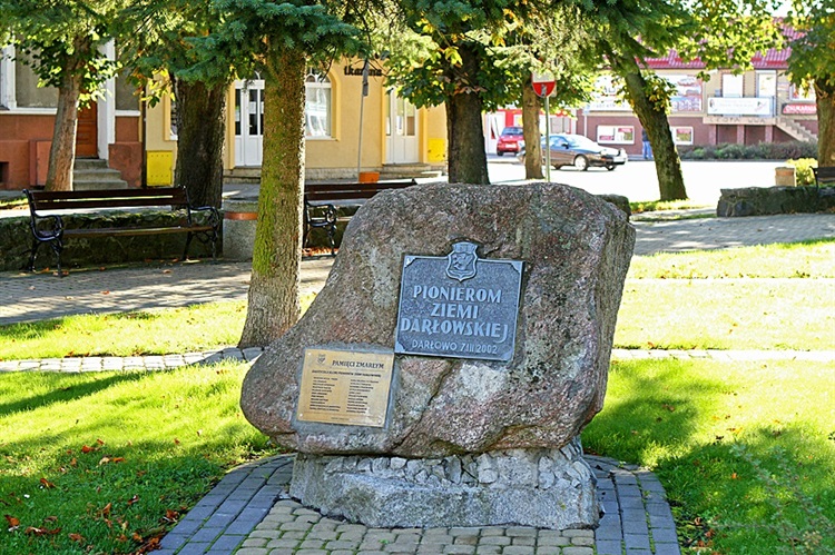 Na placu Marszałka Józefa Piłsudskiego w Darłowie stoi pomnik Pionierów Ziemi Darłowskiej. Na obelisku widnieją dwie tablice pamiątkowe. Pierwsza tablica z napisem: Pionierom Ziemi Darłowskiej wmurowana została 7 marca 2002 roku. Druga płyta pamiątkowa poświęcona pamięci zmarłym założycielom Klubu Pionierów Ziemi Darłowskiej zamontowana została jedenaście lat później - 7 marca 2013 roku.