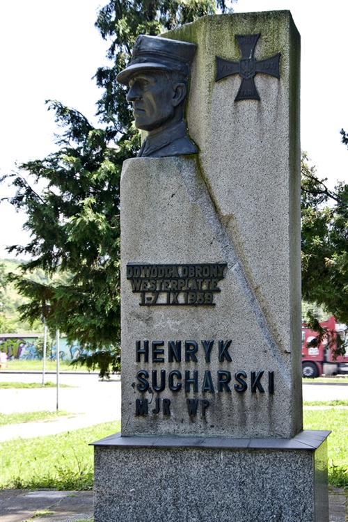 Pomnik Henryka Sucharskiego ustawiono przy al. Sucharskiego. Na granitowej bryle znajduje się rzeźbiona głowa Henryka Sucharskiego w polowej czapce wojskowej i napis: dowódca obrony Westerplatte 1-7 IX 1939 - Henryk Sucharski mjr WP. Obok Krzyż VM.