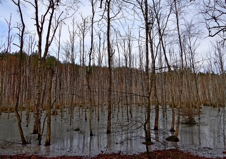 Warto zatrzymać się właśnie tutaj i ruszyć na spacerek wzdłuż głównej drogi. Po kilkudziesięciu metrach dotrzemy do niezwykle urokliwej brzeziny. Urokliwej i nietypowej, bo…zatopionej. Z lustra wody sterczą tu ku niebu białe kikuty pni. Miejsce jest po prostu bajkowe.