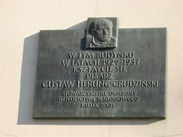 Jedna z tablic umieszczonych na zewnętrznej elewacji budynku obecnego Muzeum Lat Szkolnych Stefana Żeromskiego poświęcona jest Gustawowi Herlingowi-Grudzińskiemu (1919-2000) - polskiemu pisarzowi, eseiście, dziennikarzowi, żołnierzowi i więźniowi łagrów oraz obozów NKWD. W latach 1929-1937 kształcił się w murach ówczesnego gimnazjum. Tablica ufundowana została w 2001 roku przez Stowarzyszenie Ochrony Dziedzictwa Narodowego.