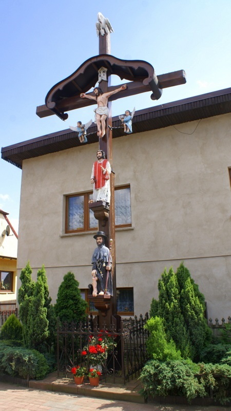 Jest to wysoki, wielofigurowy krzyż drewniany z drugiej połowy XIX wieku. W centralnej części, pod ozdobnym zadaszeniem widnieje figura ukrzyżowanego Chrystusa z figurkami aniołków u stóp. Natomiast poniżej figury św. Rocha i św. Wojciecha, w zwieńczeniu krzyża jest pelikan karmiący młode. Wszystkie ludowe rzeźby wykonane zostały z drewna i upiększone polichromią.