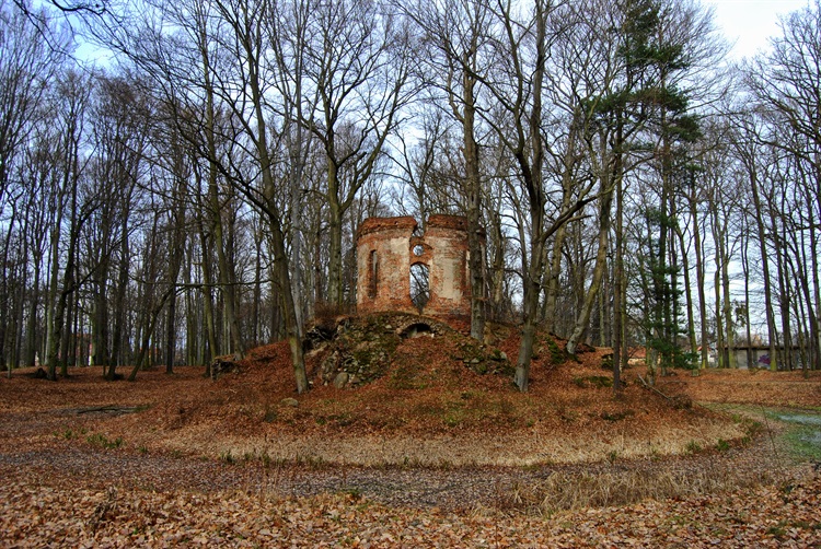Charakterystyczna ceglana, cylindryczna budowla zbudowana na wyspie otoczonej fosą pełniła funkcję salonu wodnego. Obiekt posiadał cztery pomieszczenia, trzy służyły dla pracownika, natomiast w czwartym była pompa wodna, która obsługiwała mieszczącą się tutaj fontannę, z której woda tryskała z pysków delfinów i kaczek. Budynek źle został skontrowany, co sprawiło, że w niedługim czasie zawalił się cylindryczny dach, który wieńczył obiekt. Architekci, postanowili zburzyć mostki prowadzące do obiektu, co sprawiło, że salon wodny stał się trwałą ruiną, która niebawem, może się całkowicie zawalić.
