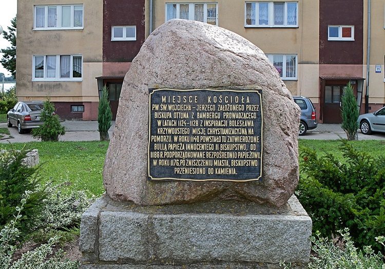 Na osiedlu mieszkaniowym w Wolinie stoi pomnik z płytą upamiętniającą nieistniejący kościół św. Jerzego. Głaz stoi w miejscu kościoła pod wezwaniem św. Wojciecha - Jerzego. Kościół założył biskup Otton z Bambergu. W 1140 roku w Wolinie zostało zatwierdzone biskupstwo. Po zniszczeniu miasta w 1176 roku biskupstwo przeniesiono do Kamienia.