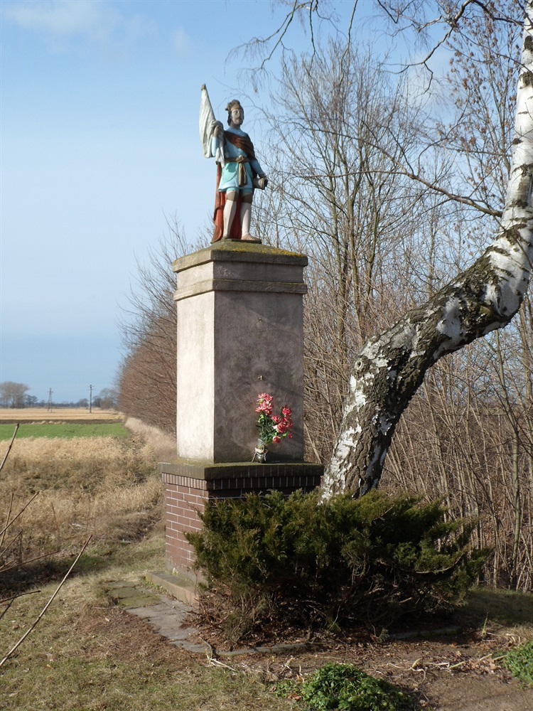 Wspomniana przydrożna kapliczka poświęcona jest św. Florianowi patronowi m.in. Królestwa Polskiego oraz strażaków. Rzeźba z piaskowca na wysokim, murowanym cokole stanęła w tym miejscu około połowy XIX wieku. Figura świętego trzymającego chorągiew i wiadro pomalowana została wielobarwnymi farbami. Kapliczce towarzyszy dorodna brzoza, a jej tło stanowią pola z rosnącymi drzewami przy biegnących wśród nich drogach.