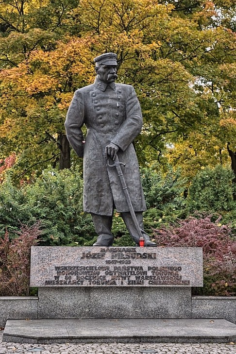 Czterometrowy pomnik z brązu odsłonięty został latem 2000 roku. Przedstawia postać marszałka w pozie refleksyjno-spoczynkowej (lekko pochylona sylwetka). Autorami monumentu są Stanisław Szwechowicz i Bruno Wandtke.