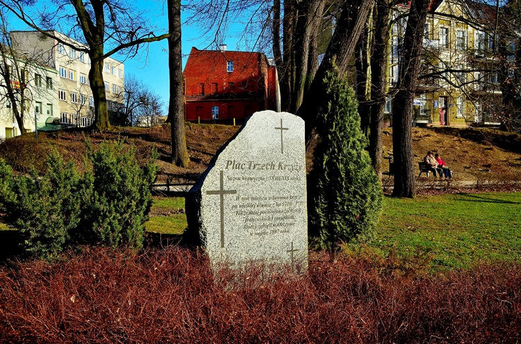 Ten plac istniał już w XVIII w., jednak nawet wiek później nie posiadał jeszcze oficjalnej nazwy, określenie Drei-Kreuze-Platz, czyli Plac Trzech Krzyży lub Plac przy Trzech Krzyżach, funkcjonowało tylko w mowie potocznej. Wspomniane trzy krzyże ustawiono na pamiątkę epidemii dżumy, która nawiedziła Olsztyn w latach 1710-1711; zaraza znacznie wyludniła miasto i okolice, oblicza się, że w samym Olsztynie zmarła jedna trzecia mieszkańców. Według kwestionariusza sporządzonego wiele lat po tych wydarzeniach epidemia mogła pochłonąć dwa tysiące ludzi, a niektóre wsie w pobliżu Olsztyna po prostu przestały istnieć.
