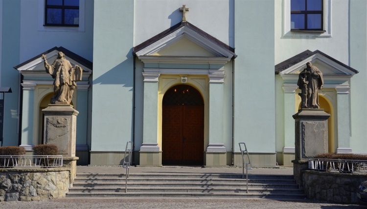 Figury ustawione przed głównym wejściem przedstawiają św. Piotra z Alkantary - patrona straży miejskiej oraz św. Jana Kapistrana - patrona prawników. Natomiast przy bocznym wejściu od ul. Kościelnej na postumentach stoją figury przedstawiające św. Jana Sarkandra - patrona dobrej spowiedzi oraz św. Jana Nepomucena - patrona miedzy innymi spowiedników i tonących.
