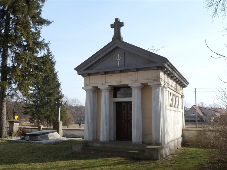 Kaplica grobowa Ponikiewskich zbudowana została w początkach XX w. w neoklasycystycznej formie. W tympanonie elewacji frontowej znajduje się herb rodowy Trzaska.