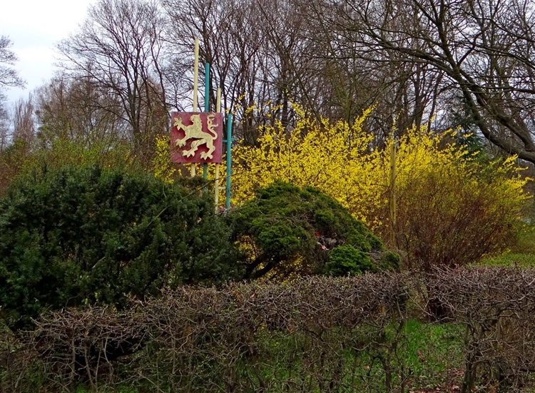 Tuż obok, na tym samym skwerku otoczonym sześcioma okazami grujecznika japońskiego znalazło się też miejsce dla ocalałego fragmentu dawnego pomnika poległych w wojnach austriacko-pruskiej (1864-66) i francusko-pruskiej (1870-71). Pomnik stał kiedyś naprzeciwko ratusza. Miał formę sześciobocznej kolumny z neogotyckim zwieńczeniem. Na jej podstawie – również sześciobocznej – wykuto nazwiska poległych mieszkańców wsi Damm (przyłączonej do Dębna w 1894 r.), Dębna (Neudamm), Mostna (Kerstenbrügge) i Oborzan (Nabern). Ciekawego znaleziska dokonano podczas prac na terenie jednego z byłych dębniańskich zakładów produkcyjnych i – żeby nie zaginęło – przetransportowano je do parku. Inskrypcje nadal są wyraźne.