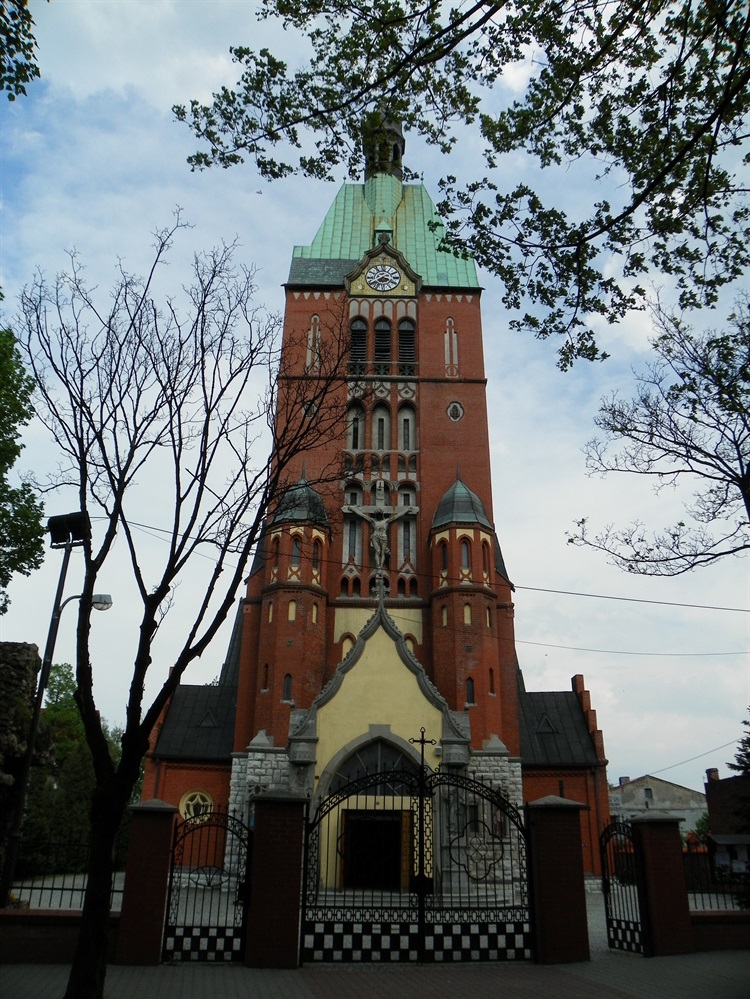 Jest to budowla wybudowana na planie krzyża łacińskiego, z cegły pełnej klinkierowej, nieotynkowana, orientowana na wschód, z masywną wieżą o wysokości ok. 50 metrów. Stylowo nawiązuje do epok romańskiej i gotyckiej, jednak jest to tzw. „neostyl”, w bryle którego można zauważyć wiele ciekawych elementów zdobniczych wykonanych z kamienia. Niewątpliwie w oczy „rzuca się” krzyż wykonany z żelbetu i rzeźba Ukrzyżowanego Chrystusa na Krzyżu, która prawdopodobnie także wykonana jest z tego lub podobnego materiału.