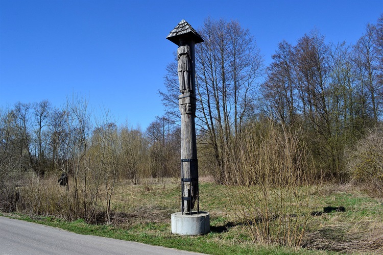 Dokładna data jej powstania nie jest znana. Jedne źródła mówią o końcu XVII, inne o połowie wieku XIX. Rozbieżność jest więc całkiem spora, gdyż wynosząca ok. 150 lat. Do niedawna okalały ją poczciwe mazowieckie wierzby. Naturalnej wielkości figura świętego umieszczona została na drewnianej kolumnie kilkumetrowej wysokości. Antyczna kolumna, a na niej barokowo ujęta figura świętego o wyraziście wyrzeźbionych szczegółach szaty i całej postaci, a także daszek chroniący ją przed opadami - wszystko razem tworzy zgrabną artystycznie całość niepowtarzalną w takim ujęciu.