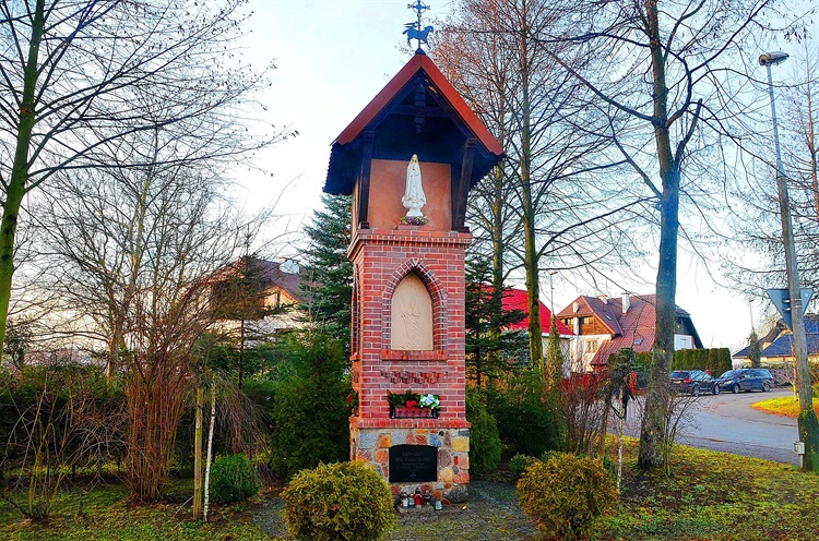 We wspornikowym podcieniu od frontu umieszczono figurkę Matki Boskiej Fatimskiej. Kapliczka jest więc bardzo bogata w symbolikę. Poza charakterem Maryjnym ukazuje nam patronów Polski i Olsztyna. Ta budowla choć odbiega trochę od warmińskiego ducha ukrytego w tych starych kapliczkach rozsianych przy drogach, to jednak emanuje od niej z pewnością przywiązanie do dawnych tradycji i wartości.