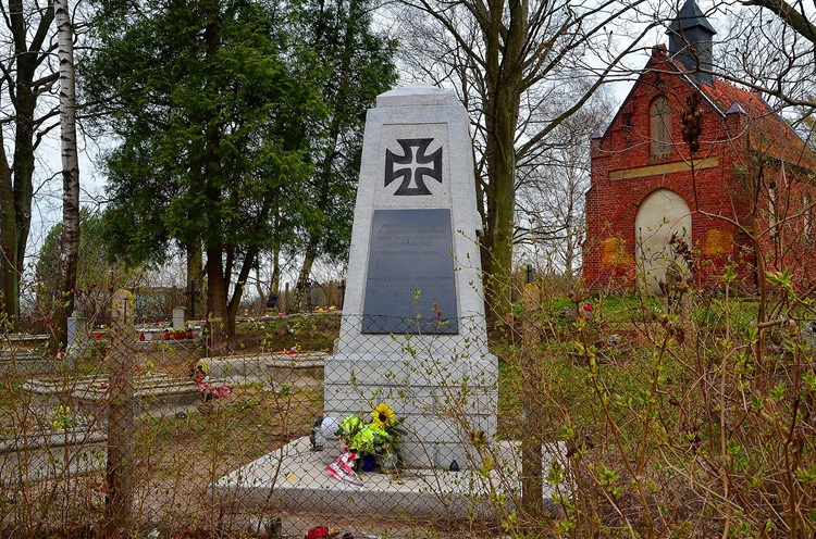 Na tym cmentarzu prócz grobów mieszkańców odnaleźć również można mogiły żołnierzy z okresu wymienionej tu wojny, są one jednak trudne do zidentyfikowania. Pomnik ma kształt stożka o kwadratowej podstawie którą ustawiono na niewielkim podwyższeniu, na lewym i prawym boku umieszczono płaskorzeźbę przedstawiającą żołnierski pruski hełm oraz daty 1914-18. Pierwotnie fasada tego obelisku ozdobiona była krzyżem maltańskim oraz tablicą z wyrytymi nazwiskami mieszkańców tej dawnej wsi. Niestety ta pamiątkowa płyta została skradziona prawdopodobnie jeszcze w latach siedemdziesiątych i nigdy nie odnaleziona.