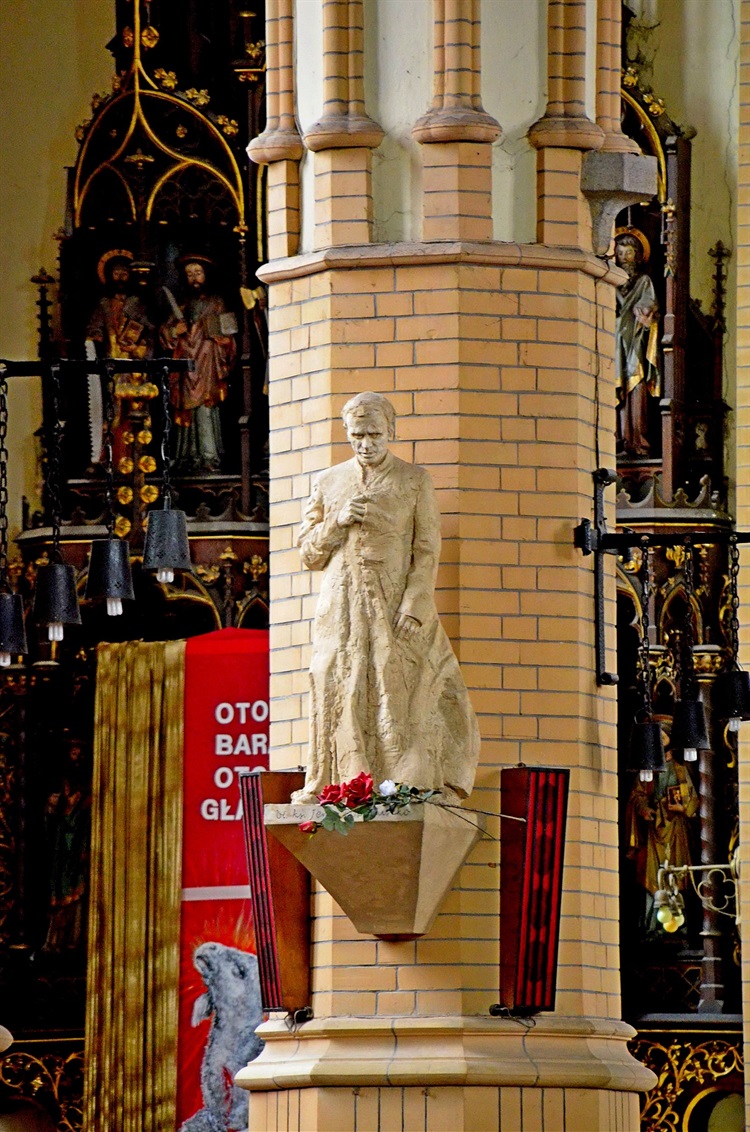Figura została umieszczona na jednym z filarów kościoła który znajduje się najbliżej ołtarza głównego, przedstawia ona ks. Popiełuszkę w postawie stojącej z lekko spuszczona głową, jego prawa ręka spoczywa na piersi natomiast sutanna bez żadnych atrybutów układa się jakby dynamicznie szedł. Autorem tego niewielkiego monumentu Adam Cieślak, nauczyciel olsztyńskiego Liceum Plastycznego.