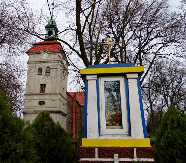 Zwracająca uwagę budowla to jedyny zabytek Mościc. Składa się z dwóch różnych części – zbudowanego na planie krzyża kamienno-ceglanego korpusu i barokowej, otynkowanej wieży. Sam kościół pochodzi z roku 1868. Powstał z przebudowy wcześniejszego, również kamiennego obiektu poważnie zdewastowanego w czasie wojny siedmioletniej. Wieża jest starsza (1737), ale jeszcze do czasów drugowojennych przechodziła kilka remontów. Wnętrze skromne. Z otaczającego świątynię cmentarzyka nie pozostało nawet wspomnienie. (akapit)