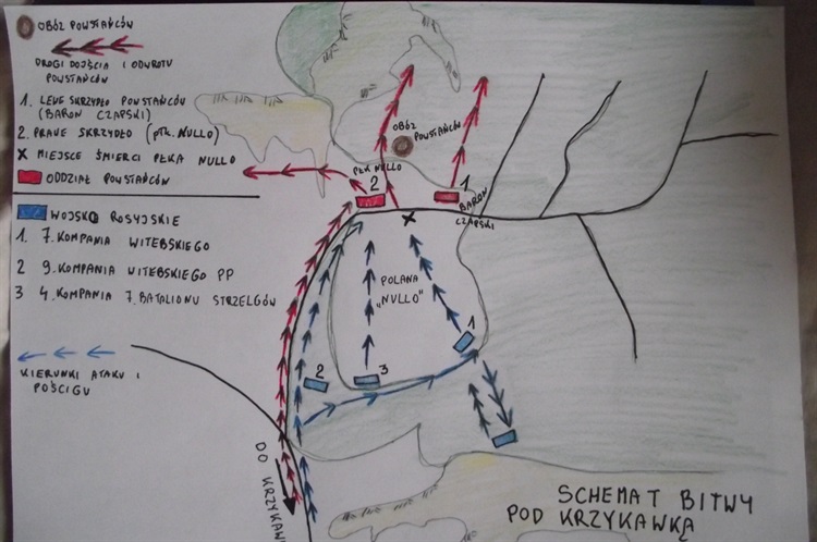 Koleje bitwy odwróciły się na niekorzyść powstańców. Silny i niszczący ogień, a do tego śmierć płk Francesco Nullo, spowodowały, iż w pewnym momencie podniosła się panika i powstańcy zaczęli uciekać w kierunku Błędowa i Chechła, a za nimi rozpoczął się morderczy pościg Rosjan, który na chwilę zatrzymał się przy moczarach rzeki Białej. Uczestnik bitwy, a właściwie jej obserwator rotmistrz Julian Pikuziński wspominał, iż dzień wcześniej został ranny w starciu z Moskalami w rękę, dlatego też nie brał czynnego udziału w bitwie pod Krzykawką, tylko ją obserwował na skraju lasu w przebraniu krakowskiego chłopa, w sukmanie i wysokim kapeluszu, gdyż miał być wysłany z depeszami do Krakowa.