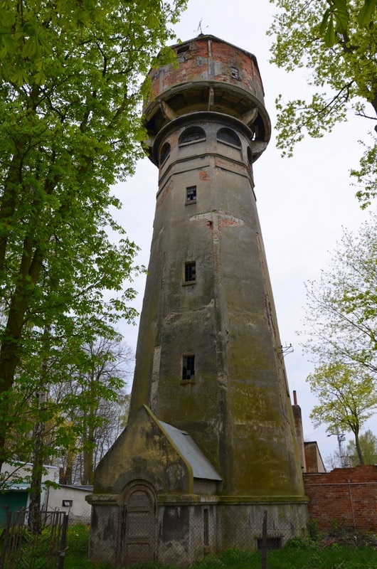 Wieża ciśnień została wzniesiona w latach 1908 -1909. Zbudowana na rzucie ośmioboku z przylegającą boczną, prostokątną, niewielką przybudówką stanowiącą wejście do wieży. Na trzonie wieży zwężającym się ku górze znajduje się głowica zwieńczona ośmiobocznym hełmem z chorągiewką wietrzną. Na chorągiewce widnieje rok 1909 tj. rok, w którym wieża została zbudowana.