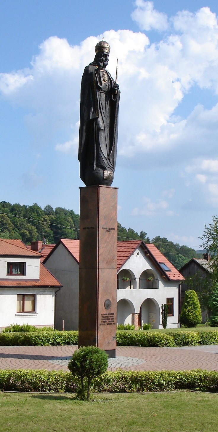 Pomnik ustawiono w pobliżu kościoła nieopodal starej szkoły, w roku 2000. Jego autorem i fundatorem jest wywodzący się z Nowego Wiśnicza artysta rzeźbiarz profesor Krakowskiej Akademii Sztuk Pięknych Czesław Dźwigaj. Figura Chrystusa Króla stoi na kuli ziemskiej, która spoczywa na granitowym cokole. Na kuli umieszczono napis ”Jezu Chryste Królu wszechświata błogosław naszą Ojczyznę”.