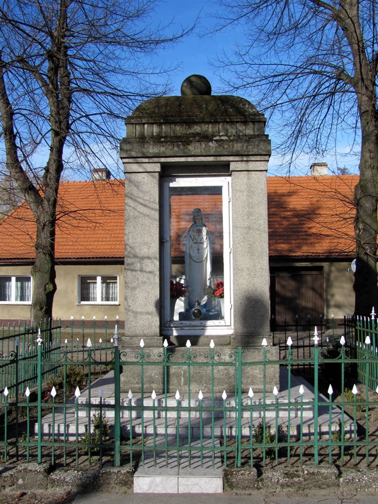 Murowana kapliczka znajduje się w rynku, w pobliżu dawnego przypałacowego kościoła ewangelickiego. Wcześniej był to pomnik poległych w I wojnie światowej. We wnęce zabezpieczonej szybą znajduje się figura Matki Bożej.