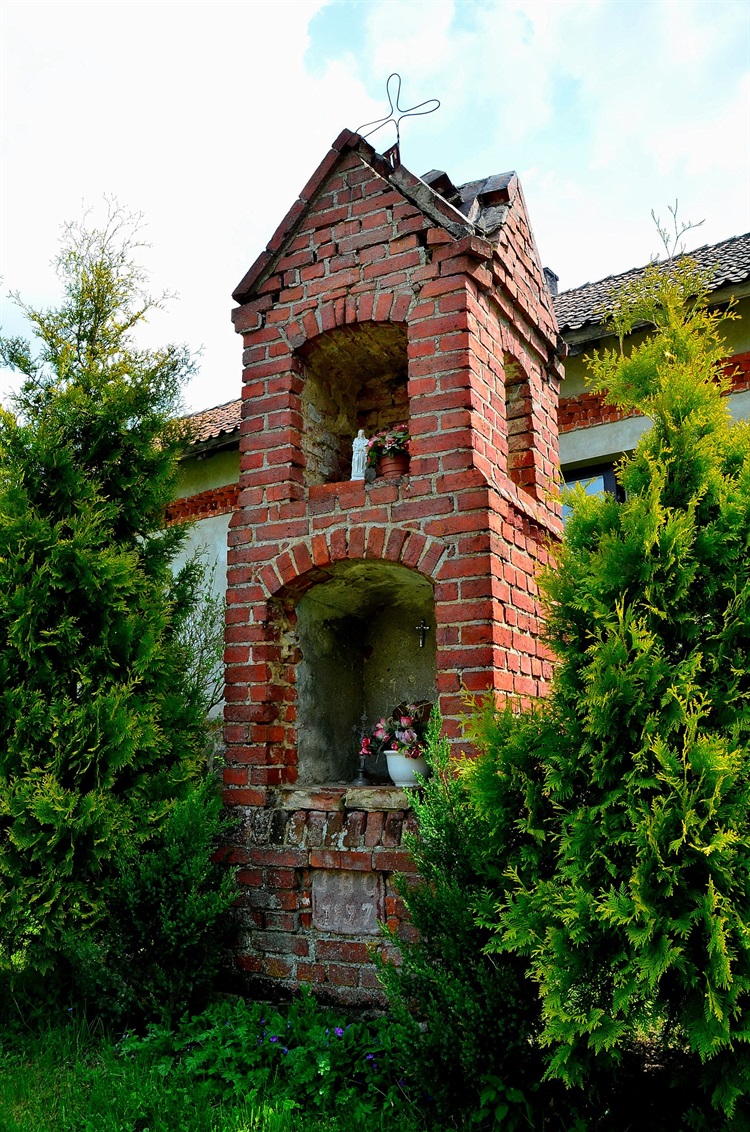 Pierwsza usytuowana jest na zakrzaczonym wzniesieniu obok prywatnego gospodarstwa. Ufundowana została 1874 r. i niestety nie przetrzymała do naszych czasów w dobrej kondycji, jest to raczej ruina która być może za kilka następnych lat będzie tylko wspomnieniem. Wybudowano ją w stylu neogotyckim dwupoziomowa i murowana z czerwonej cegły, z licznymi wnękami od frontu i po bokach ale tylko w jednej z nich można dojrzeć resztki figury bo inne zieją już tylko pustką. Całość przykrywa dwuspadowy daszek z ceramiczną dachówką.