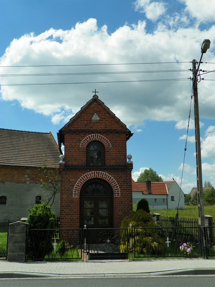 W elewacji frontowej, po jej bokach widoczne są elementy stylizowane na sterczyny, zakończone małymi kulami. Dolna „kondygnacja” w górnej części zakończona jest „fryzującą” opaską wykonaną z cegły pełnej. Górna „kondygnacja” od strony frontu jest niemal powtórzeniem dolnej, zwieńczona ścianką szczytową, na której widnieje data budowy kapliczki. W otworze drzwiowym osadzone są drzwiczki (okienko), które może być czymś w rodzaju kopii dolnych drzwi, ale bez zdobień witrażowych.