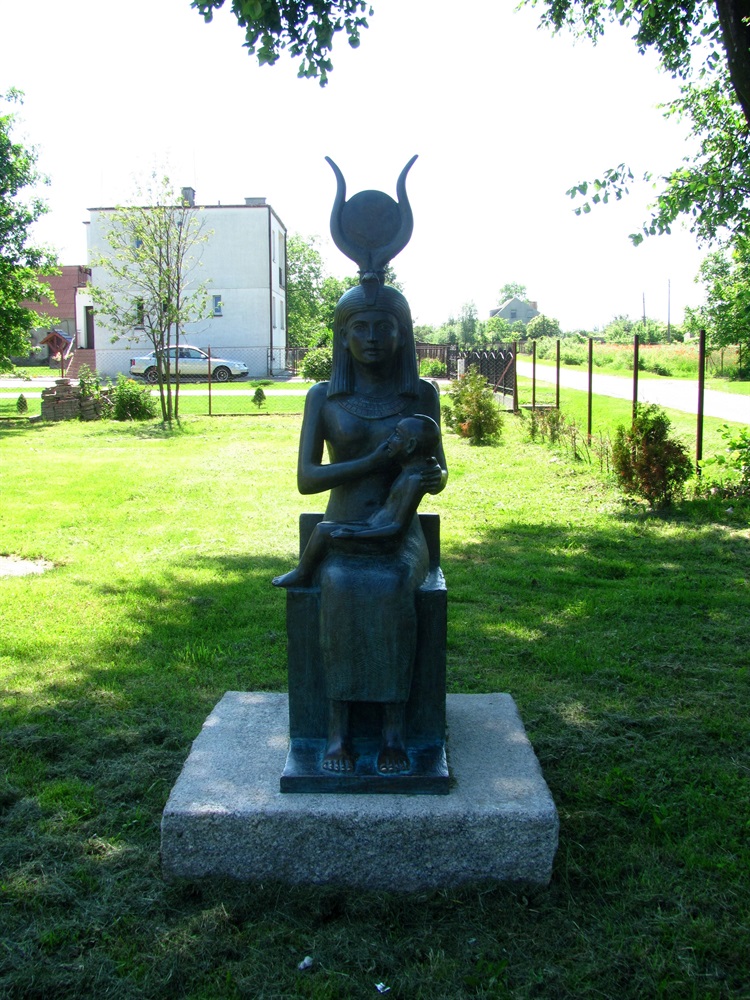 Izyda była oczywiście władczynią zarówno ziemi jak i nieba, była wcieleniem Wielkiej Macierzy, a w mitologi greckiej nazywana była boginią Demeter. Izyda była córką bogini Nut i boga Geba, siostrą i żoną Ozyrysa, którego uśmiercił Set ale Izydzie udało się przywrócić go do życia. Razem z synem Horusem byli potęgą bogów Egiptu. Pomnik w Małachowie przedstawia Izydę z małym dzieckiem, gdyż Izyda była bogiem płodności i często przedstawiano ją jako niewiastę karmiącą dziecko lub trzymającą na kolanach, stąd porównywano ją z Maryją