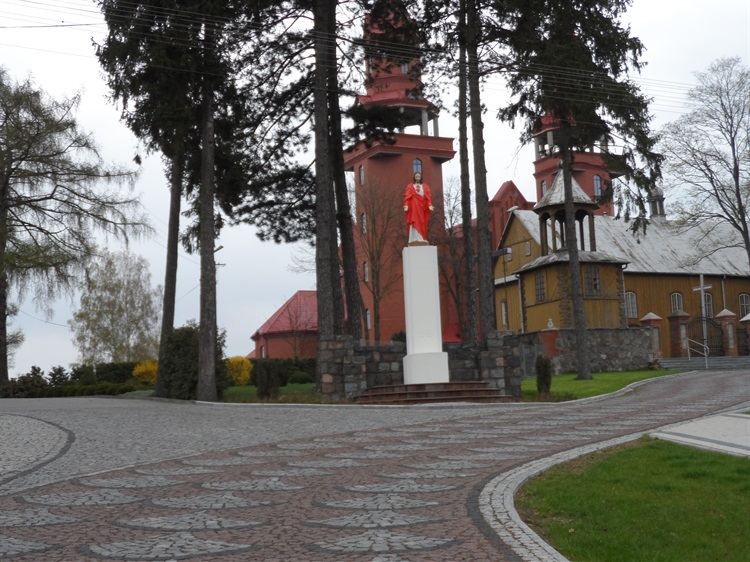 Przed murem kościoła parafialny pw. Trójcy Świętej znajduje figura Jezusa Chrystusa. Figura Jezusa Chrystusa w czerwonej szacie jest umieszczona na wysokim murowanym cokole.