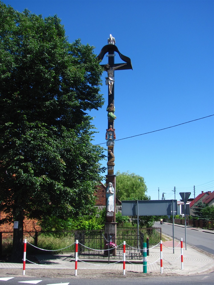 Centralną postacią jest oczywiście postać Chrystusa Ukrzyżowanego, na szczycie krzyża znajduje się postać łabędzia, poniżej mamy min. postać. św. Marii Magdaleny siedzącej na czaszce, Matki Bożej Bolesnej czy też tarcza z narzędziami Męki. Krzyż jest w dobrym stanie choć niektóre rzeźby wymagają małej renowacji
