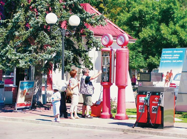 Na stacji paliw, usytuowanej na tutejszym rynku, zachował się chyba jedyny w Polsce przedwojenny ręczny dystrybutor, oryginalna atrakcja turystyczna miasta. Na podstawie, w której znajduje się dźwignia ręcznej pompy, umocowane są dwa szklane pięciolitrowe zbiorniki w formie walców. Pracownik stacji napełniał benzyną jeden ze zbiorników, po czym przekręcał zawór i benzyna spływała wężem do baku samochodu. W tym czasie napełniał drugi zbiornik, i tak na zmianę.