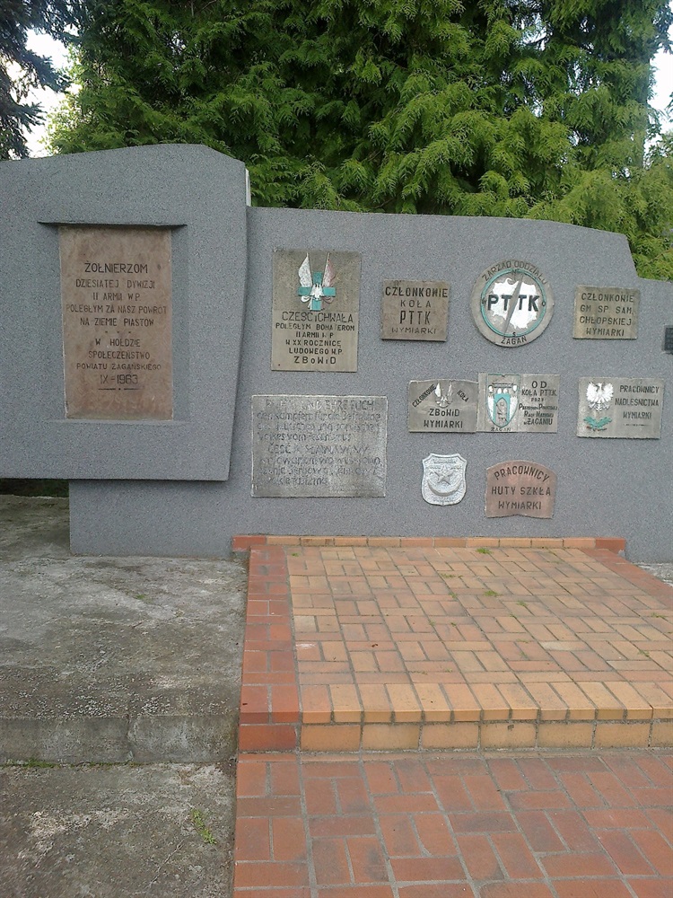 Tuż za linią nieczynnych torów kolejowych, na początku Wymiarek usytuowany jest pomnik poświęcony żołnierzom polskim poległym w okresie II wojny światowej.