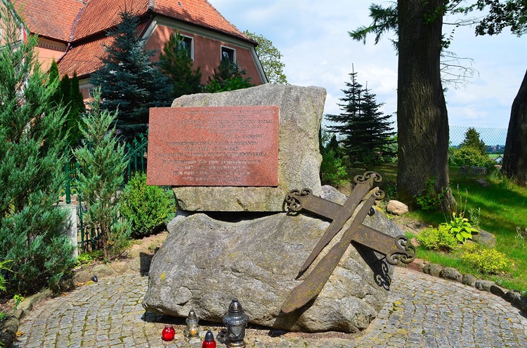 Monument ten znajduje się tuż przy kościele parafialnym. Ma formę dwóch głazów z pamiątkową tablicą i pękniętym żeliwnym krzyżem, takim samym jakie można jeszcze spotkać na starych cmentarzach w całym regionie. Lokalizacja tego obelisku nie jest też przypadkowa, bowiem w jego sąsiedztwie znajduje się grób księdza Pawła Chmielewskiego. Nie zostawił on swoich parafian i został bestialsko zastrzelony przez żołnierza radzieckiego 22 stycznia 1945 r. na terenie tutejszej plebani.