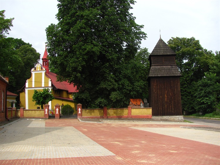 Budynek ma barokową wieżyczkę z dachem namiotowym na sygnaturkę, a ołtarz główny z krucyfiksem oraz rzeźbami pochodzącymi z XVIII wieku. Ołtarze boczne oraz ołtarz w kaplicy św. Jana Nepomucena są rokokowe. Warto zwrócić uwagę także na drewnianą dzwonnicę z XIX wieku oraz na kilka okazałych grobów znajdujących się na cmentarzu przy kościele, jak np. neoklasycystyczny grobowiec Kornobisów czy też rodziny Zabłockich. Do jednej ze ścian kościoła przylega krzyż Pawła Brylińskiego z 1849 roku.