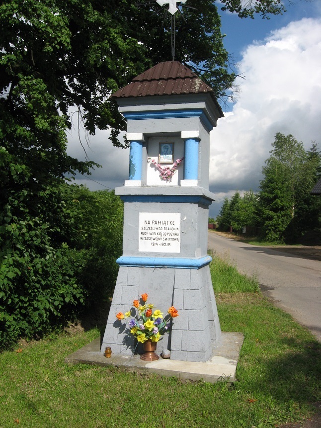 Na rozwidleniu dróg w Rudzie Wielkiej znajduje się kapliczka słupowa przykryta czterospadowym daszkiem z dachówek, zwieńczonym krzyżem. We wnęce znajduje się obrazek Matki Boskiej. Z inskrypcji na cokole dowiedzieć się można, że została wystawiona na pamiątkę szczęśliwego ocalenia Rudy Wielkiej od pożaru w czasie wojny światowej, a na końcu umieszczono dwie daty 1914 - 1921. Obiekt jest zadbany, pomalowany na kolor szaro - niebieski.