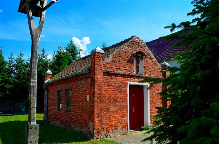 Jest to budowla jednokondygnacyjna, wzniesiona na planie prostokąta, jako budulca użyto czerwonej cegły wiązanej glinianą zaprawą, natomiast fugowanie wykonano z zaprawy wapiennej w wątku krzyżowym. Frontowa elewacja kaplicy jest jednoosiowa i zwieńczona trójkątnym szczytem ujętym lizenami, przechodzą one w sterczyny zakończone piramidkami. Pomiędzy lizenami nad otworem drzwiowym znajduje się nisza, w której umieszczono figurę Chrystusa Ukrzyżowanego, całość kryje dwuspadowy dach z ceramicznej dachówki. Godna uwagi jest także znajdująca się pomiędzy jezdnią a tą budowlą drewniana słupowa dzwonniczka pochodząca z tego samego okresu, wykonano ją z pnia dębu rozwidlonego na górze.
