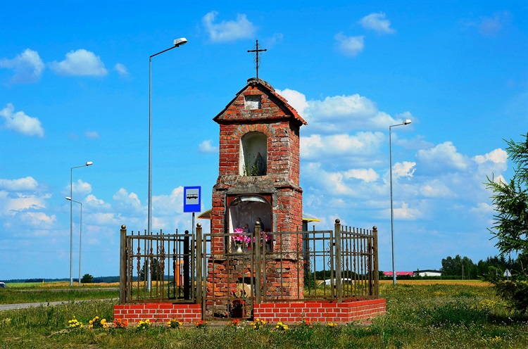 Kapliczka powstała w XIX w. i utrzymano ją w stylu neoklasycystycznym, jest zbudowana z czerwonej cegły i nieotynkowana. Posiada dwie kondygnacje z dwiema łukowatymi niszami oraz prostokątną płyciną w szczycie dachu. Wnęki noszą jeszcze ślady otynkowania i pomalowania na biało co daje ładny kontrast z czerwienią cegły, taki zabieg dekoracyjny był bardzo często stosowany w kapliczkach na Warmii. W dolnej przeszklonej niszy umieszczono figurę Matki Boskiej oraz pomniejsze dewocjonalia, wszystko to udekorowane jest często sztucznymi kwiatami. Nisza górna zawiera także figurę Matki Boskiej, kwadratowa najwyższa płycina jest pusta.