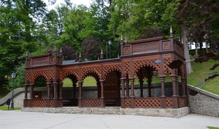 Nad odkrytym zdrojem w 1839 r. postawiona została stylowa, wieloboczna, drewniana altana nakryta stromym dachem namiotowym. 27 lat później została zbudowana tutaj kryta galeria spacerowa przyozdabiana w okresie zimowym rzeźbami przedstawiającymi cztery pory roku. Rzeźby te zakupione zostały przez Akademię Umiejętności dla ozdoby parku. Wodę do picia kuracjuszą podawały dziewczyny tzw. podawajki. Przed podaniem wody czerpały ją ze studni opuszczając obwiązaną sznurkiem szklankę do drewnianego drążka. Woda w ten sposób była podawana do końca lat 70 XIX wieku tj. do czasu modernizacji pijalni i zamontowaniu nad zdrojem pompy typu "Tober". W 1963 r. galeria została rozebrana a na jej miejscu w 1970 r. wzniesiono nowy pawilon pijalni.