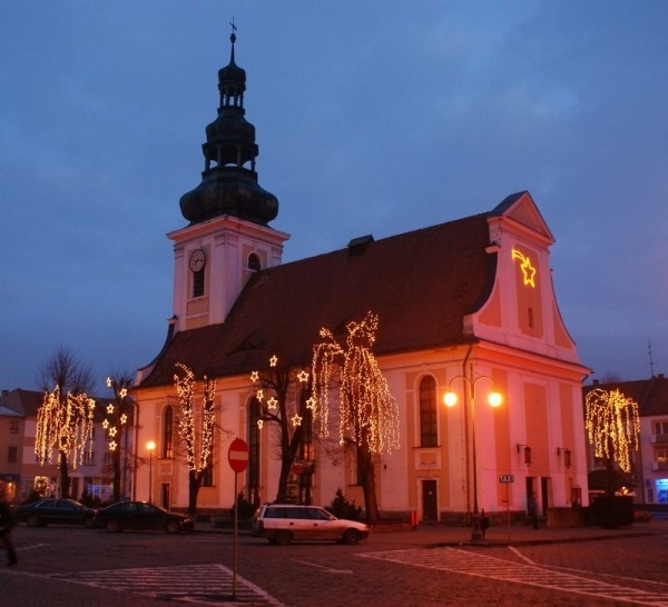 Kościół ewangelicki, ob. Kino Harmonia znajduje się w centrum rynku, 1911-12, 1958, został wpisany do rejestru zabytków Wojewódzkiego Konserwatora Zabytków pod nr rej.: A/666 w dniu z 25.07.1995 roku.